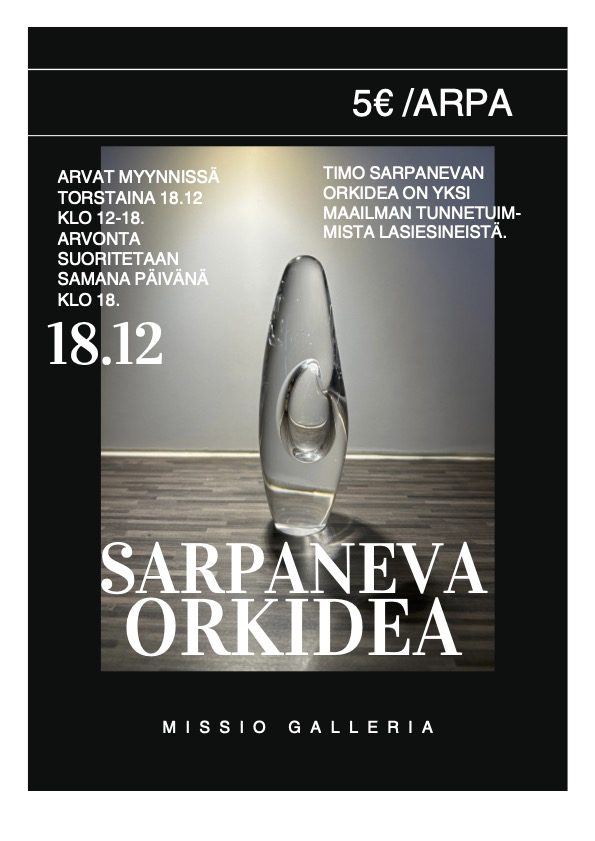 Torstaina 18.12 Missio Galleria kävijöillä on mahdollisuus ostaa 5€:n arvoisia arpoja, jossa päävoittona on Timo Sarpanevan legendaarinen Orkidea lasiveistos. Arvonta suoritetaan saman päivän iltana klo 18 ja voittajille ilmoitetaan henkilökohtaisesti. Torilla on torstaina 18.12 alueen yrittäjien kustantamaa ohjelmaa.